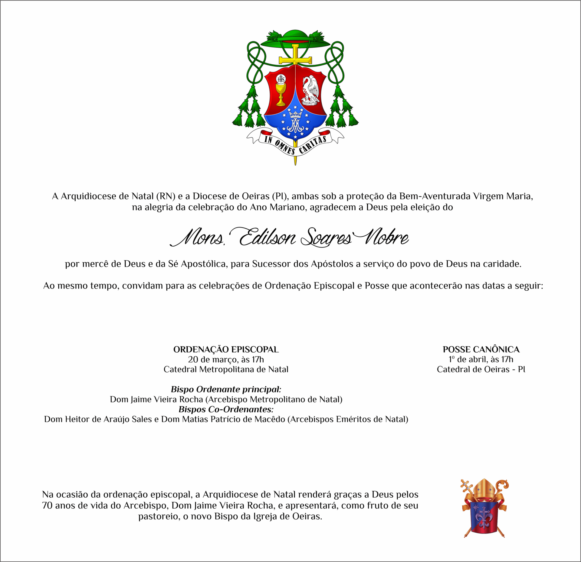 Convite para ordenação e posse do bispo eleito da Diocese de Oeiras