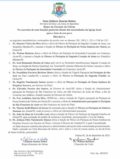 NOTA DE ESCLARECIMENTO AOS FIÉIS DA IGREJA CATÓLICA APOSTÓLICA ROMANA SITUADOS NA DIOCESE DE OEIRAS-PI Baixar arquivo Ver arquivo