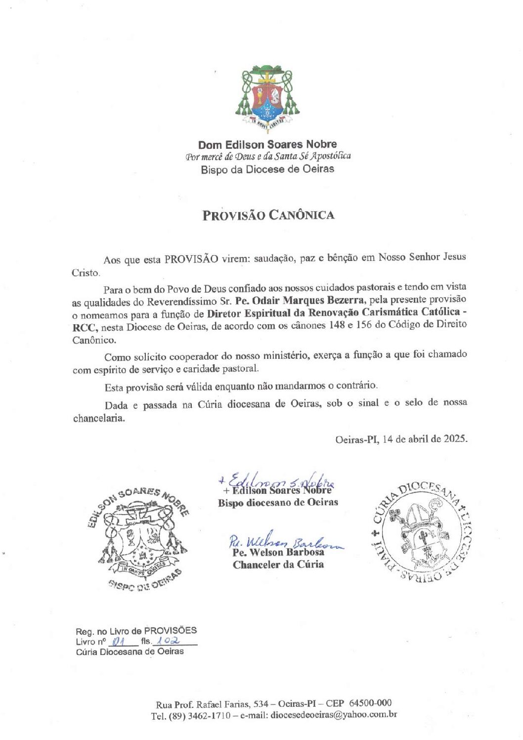 PROVISÃO CANÔNICA PE. ODAIR MARQUES – DIRETOR ESPIRITUAL DA RENOVAÇÃO CARISMÁTICA CATÓLICA Baixar arquivo Ver arquivo