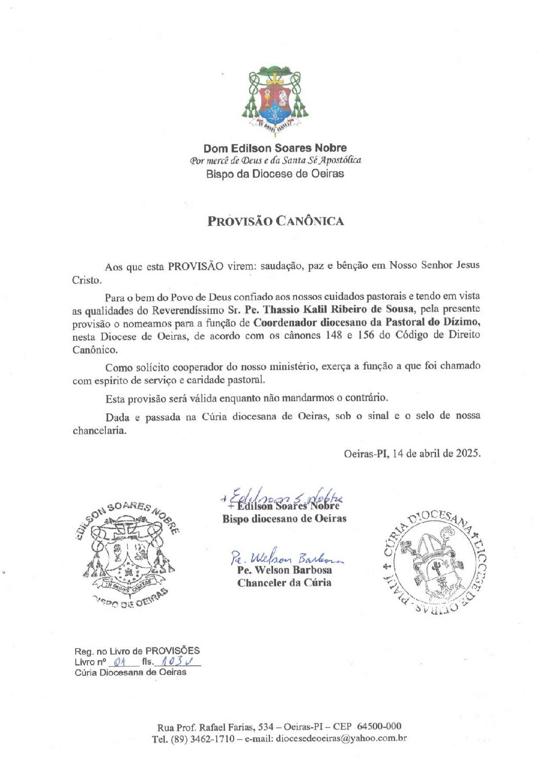 PROVISÃO CANÔNICA PE. THASSIO KALIL – COORDENADOR DIOC. DA PASTORAL DO DIZIMO Baixar arquivo Ver arquivo