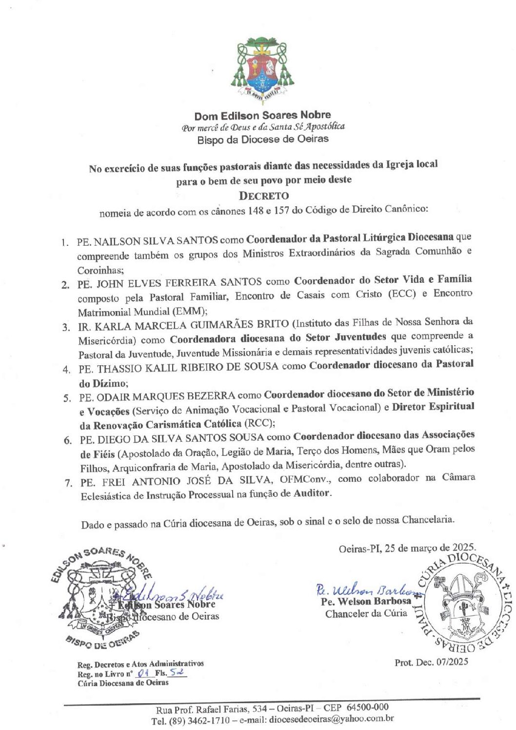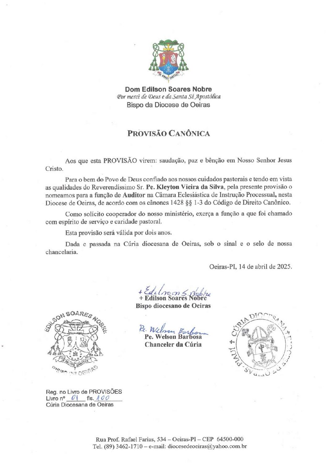 Provisão do Padre Kleyton Vieira da Silva como Vigário Geral da Diocese Oeiras Baixar arquivo Ver arquivo