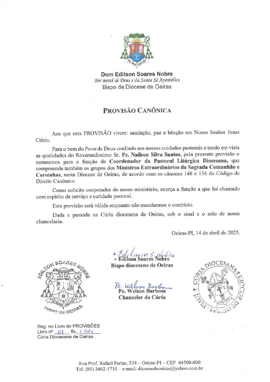PROVISÃO CANÔNICA PE. NAILSON SANTOS – COORDENADOR DIOC. DA PASTORAL LITURGICA Baixar arquivo Ver arquivo