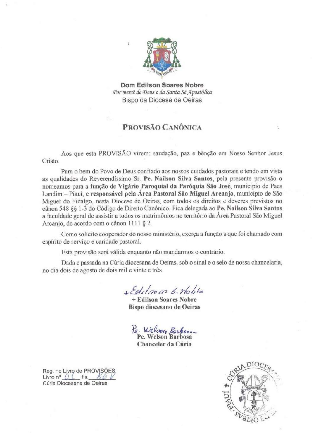 Provisão do Padre Julielmo Marques Castelo Branco como Pároco da Paróquia Santo Antônio – Colônia do Piauí Baixar arquivo Ver arquivo