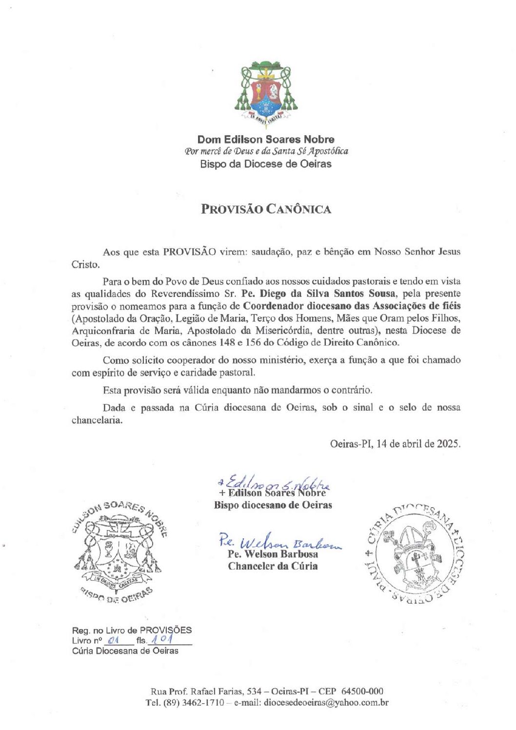 PROVISÃO CANÔNICA PE. DIEGO SOUSA – COORDENADOR DIOC. DAS ASSOCIAÇÕES DE FIEIS Baixar arquivo Ver arquivo