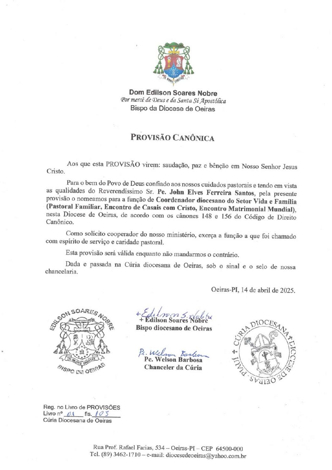 PROVISÃO CANÔNICA PE. JONH ELVES – COORDENADOR DIOC. DO SETOR VIDA E FAMÍLIA Baixar arquivo Ver arquivo