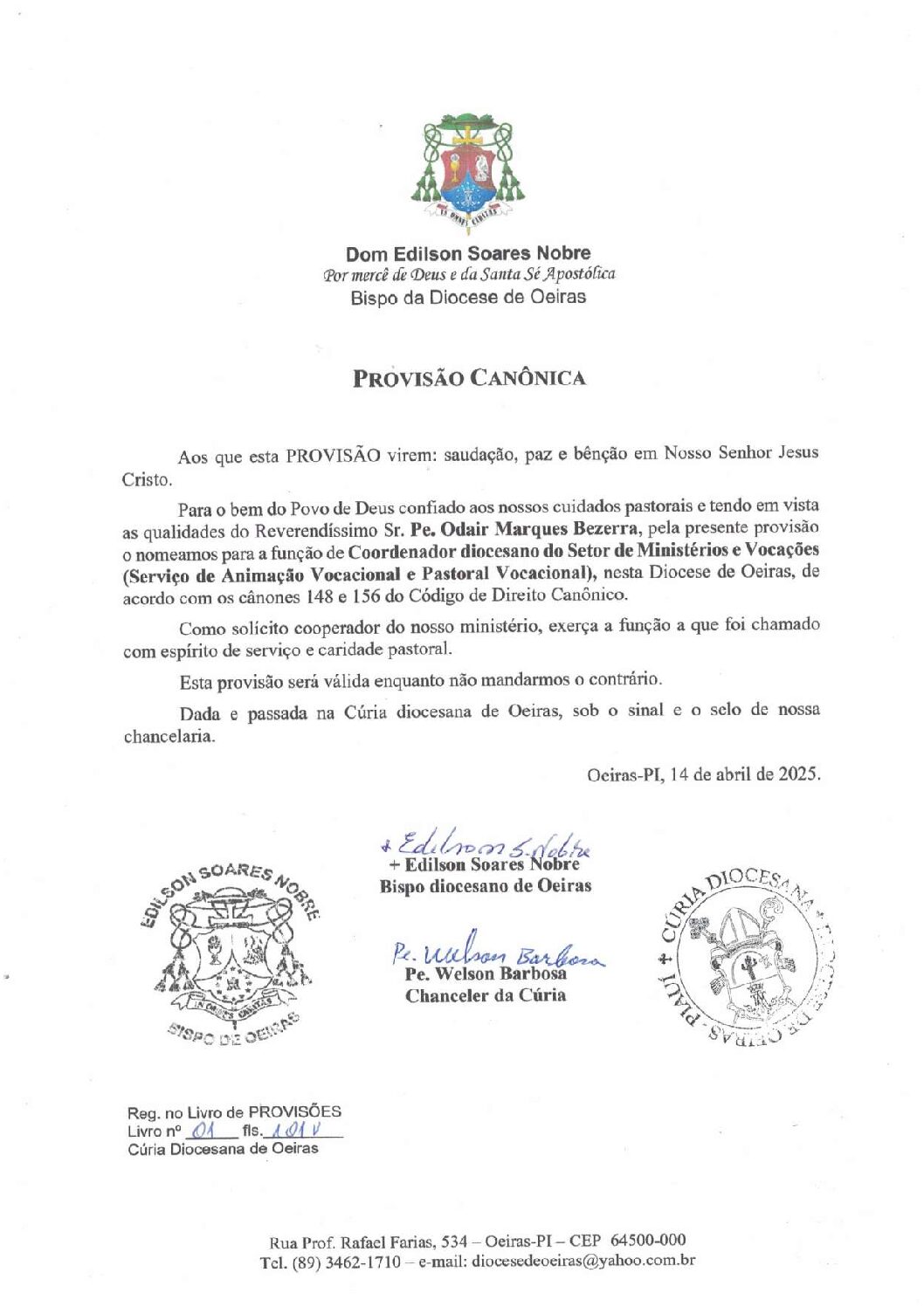 PROVISÃO CANÔNICA PE. ODAIR MARQUES – COORDENADOR DIOC. DO SETOR MINISTÉRIOS E VOCAÇÕES Baixar arquivo Ver arquivo