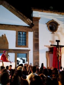No final do Sermão, a imagem do Senhor Morto, fixada no adro da Igreja Catedral, foi retirada solenemente por homens da comunidade, representando José de Arimatéia e Nicodemos, amigos de Jesus; ao som da marcha fúnebre, executada pela banda Santa Cecília. Colocada em um esquife, a imagem do Senhor Morto e a imagem de Nossa Senhora das Dores, foram levadas em procissão pelas ruas de Oeiras, parando cinco vezes, onde a Verônica (Maria Beú), interpretada neste ano, pela jovem Lara Rêgo, entoou o canto de lamentação do servo sofredor.