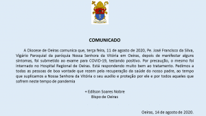 A Diocese de Oeiras comunica que, terça feira, 11 de agosto de 2020, Pe José Francisco da Silva, Vigário Paroquial da paróquia Nossa Senhora da Vitória em Oeiras, depois de manifestar alguns sintomas, foi submetido ao exame para COVID-19, testando positivo. Por precaução, o mesmo foi internado no Hospital Regional de Oeiras. Está respondendo muito bem ao tratamento.