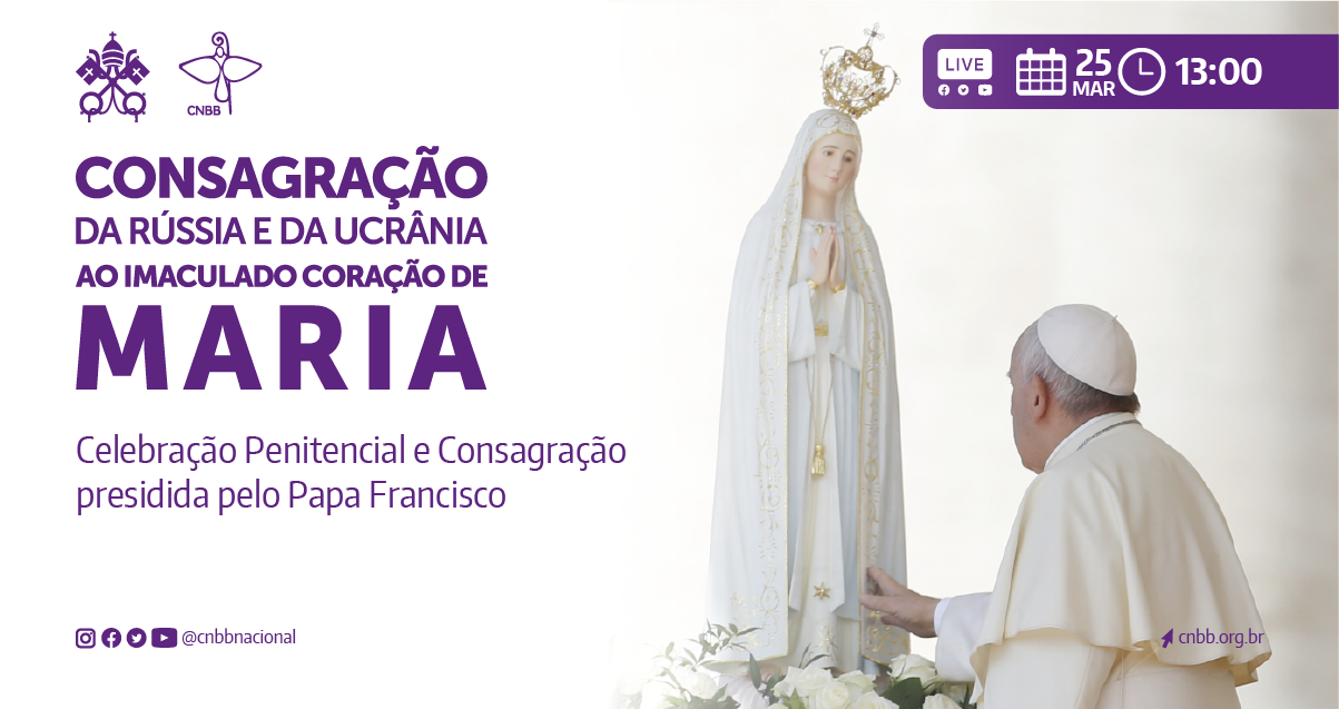 A Conferência Nacional do Bispos do Brasil (CNBB) e a Nunciatura Apostólica realizam, na próxima sexta-feira, 25 de março, às 7h, uma Celebração Eucarística, na Capela Nossa Senhora Aparecida, na sede da entidade em Brasília (DF), para estar em sintonia com o convite do Papa Francisco aos bispos de todo mundo e seus sacerdotes a se unirem a ele na oração pela paz e na consagração e entrega da Rússia e da Ucrânia ao Imaculado Coração de Maria.