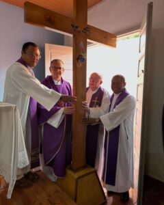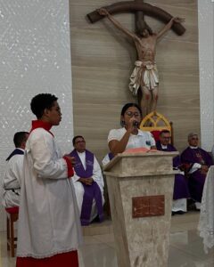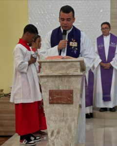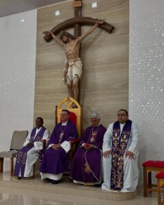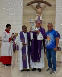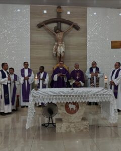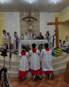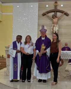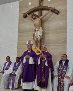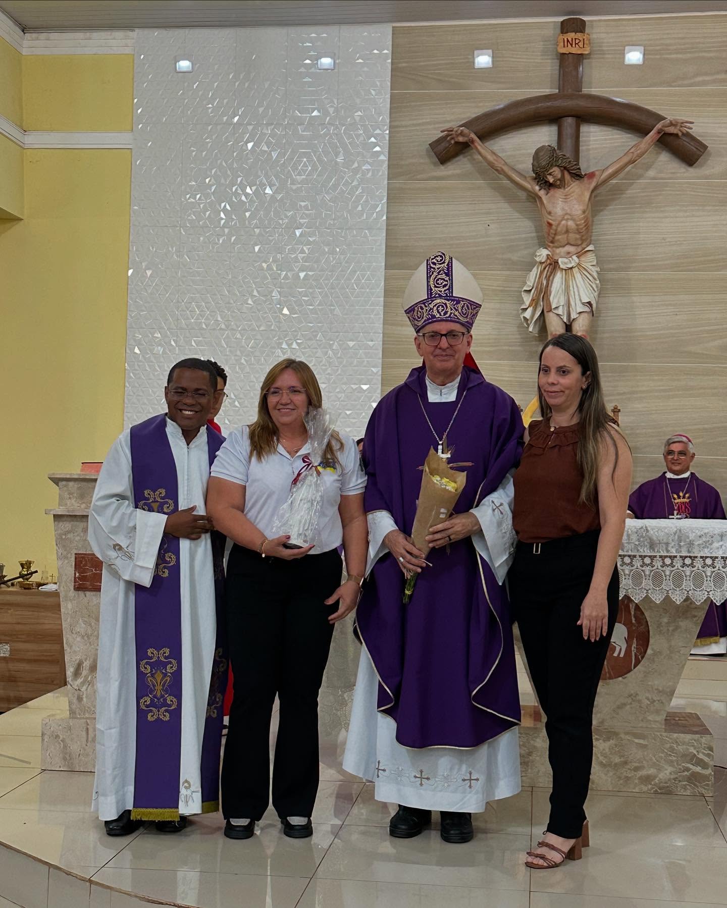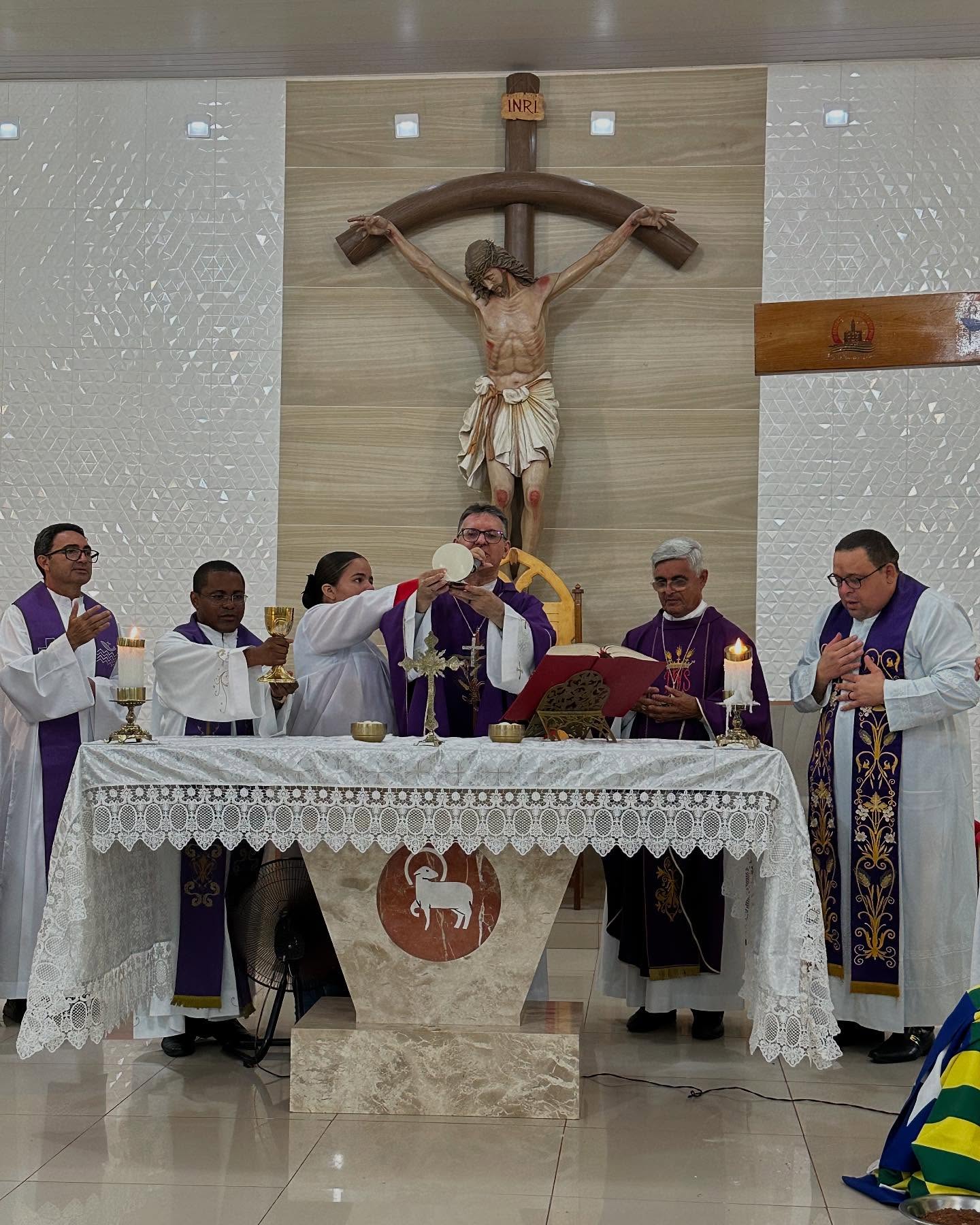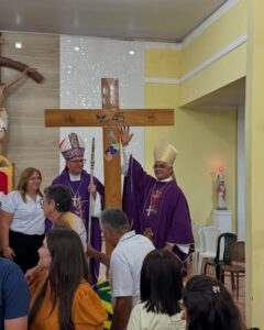 Na manhã desta quarta-feira, 02/04, a Cruz foi acolhida na Paróquia Sagrada Família com uma missa celebrada na Rádio FM Cristo Rei. Presidida por Dom Edilson Nobre e concelebrada pelo Padres: João de Deus e José Francisco Sousa.