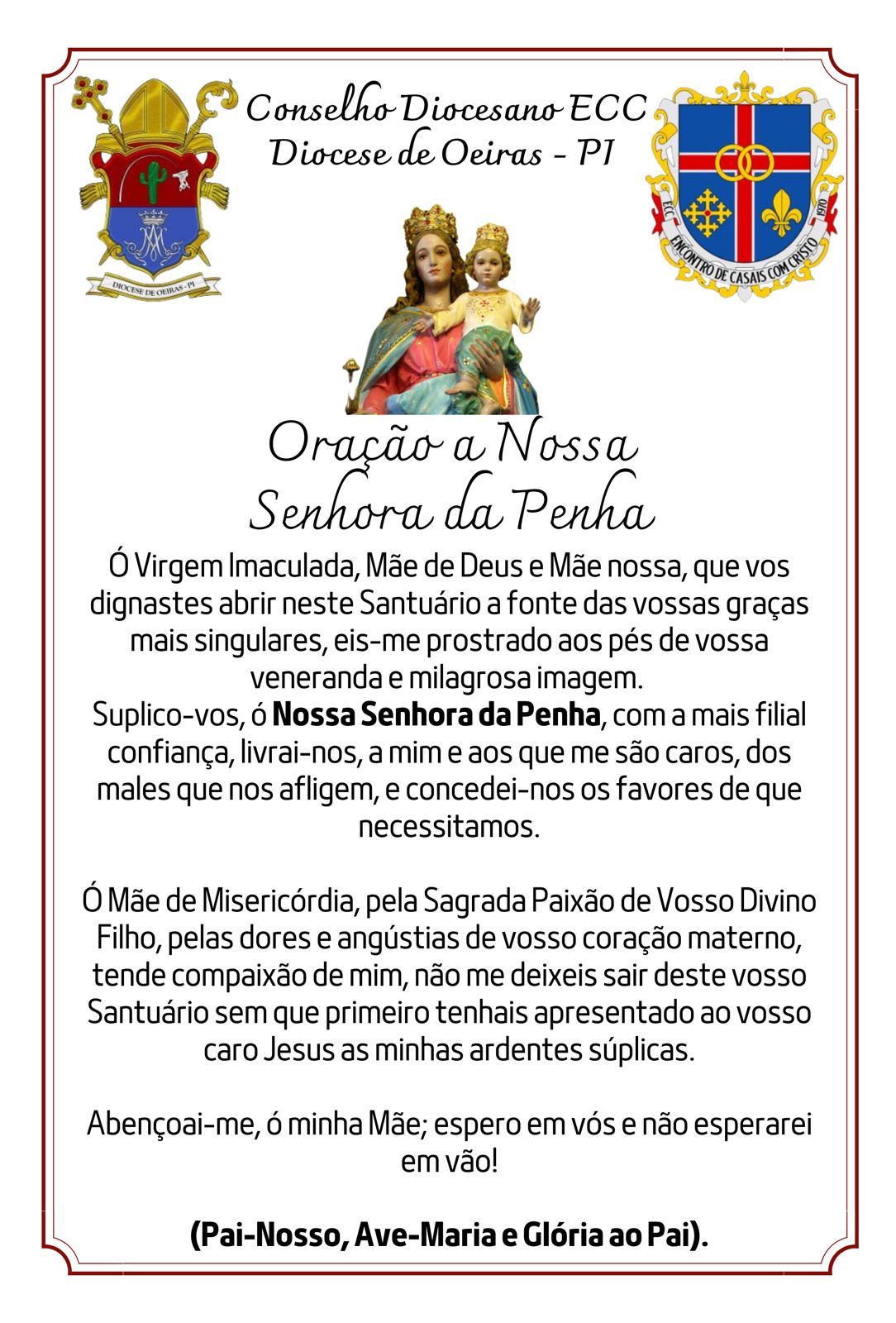 A Diocese de Oeiras se prepara para um momento especial de fé e devoção com a chegada da Imagem Peregrina de Nossa Senhora da Penha, padroeira do 19º Congresso do Encontro de Casais com Cristo (ECC) da Região Nordeste, que será realizado em julho de 2025, na cidade de Juazeiro do Norte/CE, Diocese do Crato.