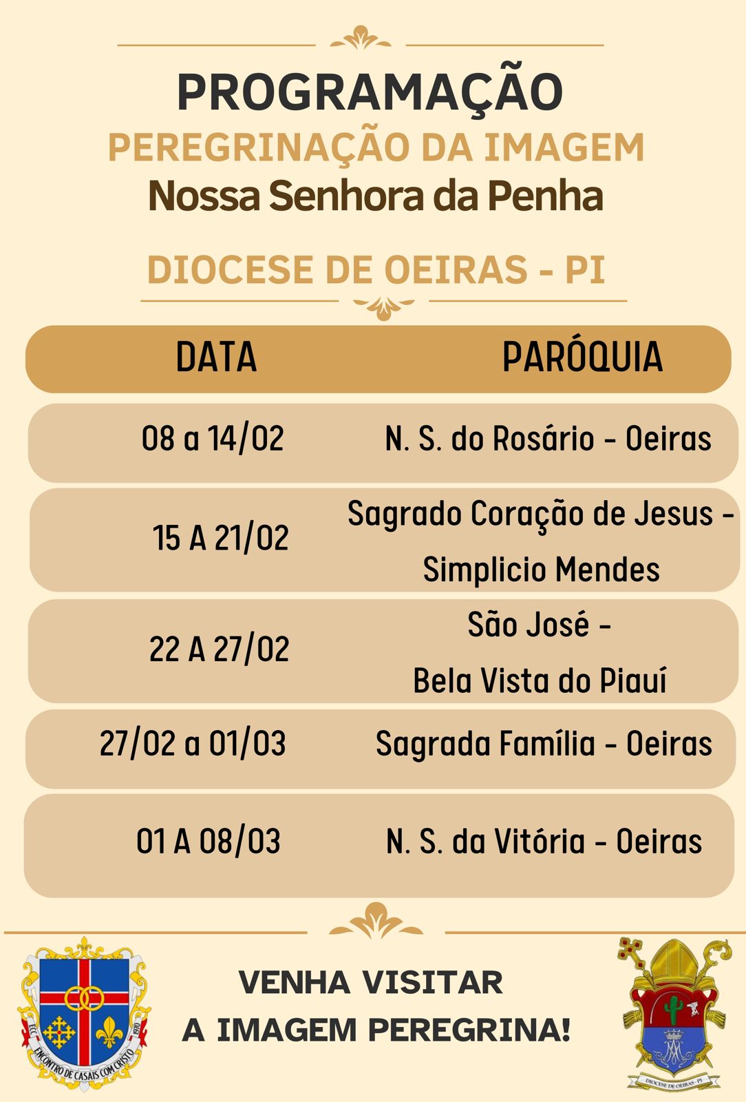 A imagem será recepcionada no dia 08 de fevereiro, às 08h da manhã, no Morro da Cruz de Oeiras, trazida pela Diocese de Floriano e recebida pelo Conselho Diocesano do ECC da Diocese de Oeiras. À noite, uma Santa Missa especial será celebrada às 19h, na Capela de Santa Luzia, localizada no Bairro Rosário, marcando oficialmente o início de sua peregrinação pela diocese.