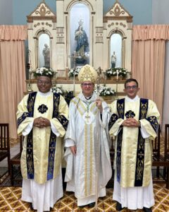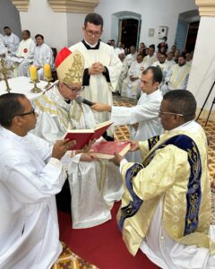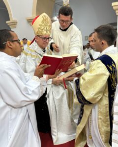 Dando prosseguimento à Celebração, Dom Edilson Nobre interrogou os ordenandos sobre suas disposições em assumir o ministério diaconal. Após a ladainha de todos os santos, lhes impôs as mãos e recitou a oração da ordenação. Já ordenados, Odair e Thássio receberam as estolas e as dalmáticas de seus pais e o Bispo diocesano lhes entregou o Evangeliário.