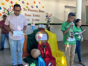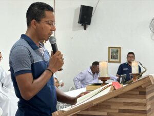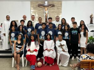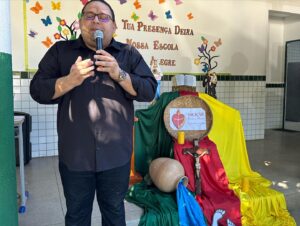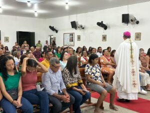 Começando mais uma vez a programação com a oração das Laudes o terceiro dia de visita pastoral constou também de encontro com as crianças e adolescentes da Iniciação à Vida Cristã onde os símbolos Círio pascal, imagem do padroeiro Santo Antônio, bíblia, terço e o crucifixo foram entronizados e apresentados inicialmente neste encontro que teve a temática musical: “Com o coração ardente, ardente de amor, eu vou seguir o bom pastor. Pés a caminho a vida é missão vivo esta graça vocação”. Em seguida, houve o animado encontro com os jovens trabalhando a temática da missa e suas partes. “Ir ao encontro dos jovens é missão de todos nós e é muito importante buscar histórias de amor transbordante por Jesus. Eles, os Santos, são os verdadeiros heróis e não os criados de forma fantasiada” (Dom Edilson). Pela tarde foi realizada visita a comunidade Estrito, a uma família enlutada seguida de outra visita a enfermo. Para finalizar a noite do terceiro dia de visita pastoral houve mais uma visita a família seguida de acolhida e missa muito bem celebrada e participada no setor Oitis que contou com o coral de jovens, homenagem de crianças ao Padre Julielmo e muitos fieis além paredes.