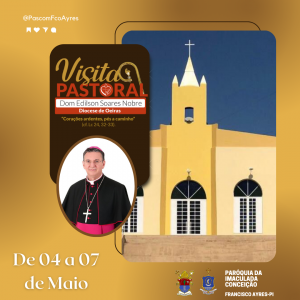 Com o objetivo de manter contatos pessoais com o clero e os outros membros do Povo de Deus, de fazer reviver as energias dos operários do evangelho, louvá-los, encorajá-los e consolá-los; e também ocasião para chamar novamente todos os fiéis à renovação da própria vida cristã, a uma ação apostólica mais intensa, tem início nesta quinta-feira, 04/05/2023, a Visita Pastoral Missionária de Dom Edilson Nobre, à Paróquia da Imaculada Conceição, no município de Francisco Ayres.