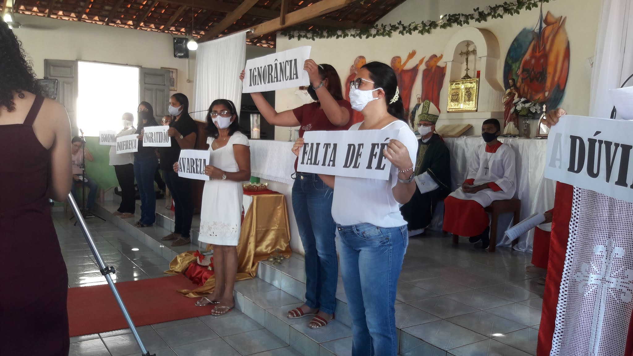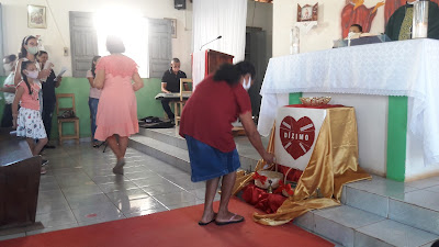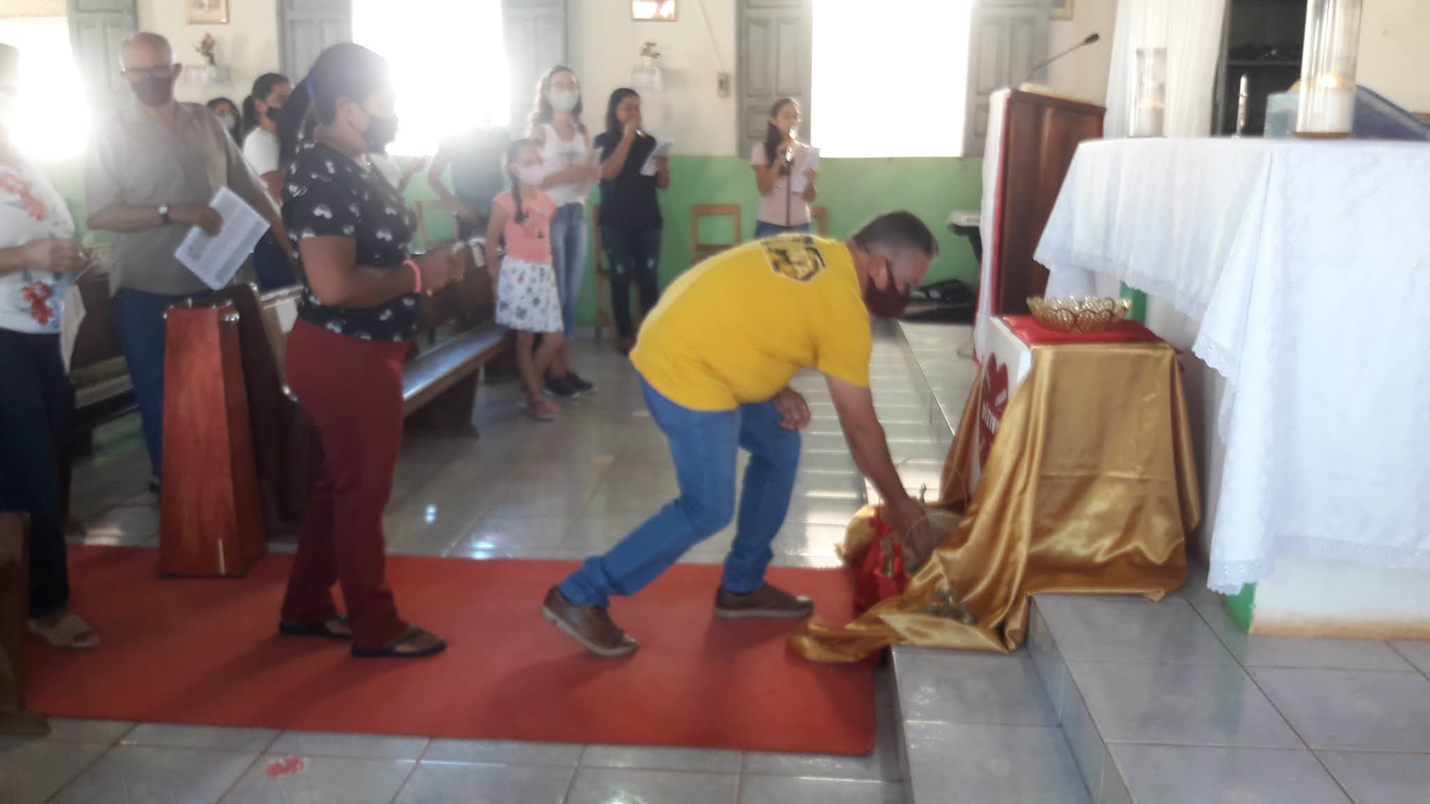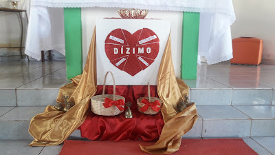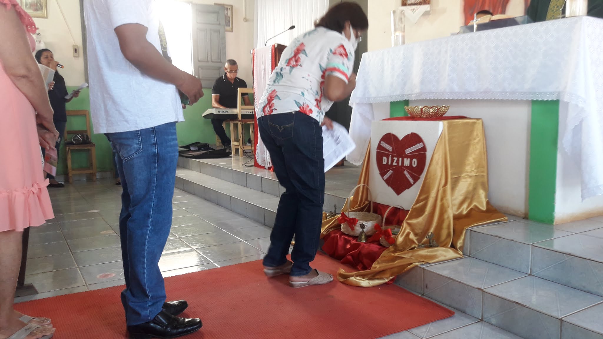 Durante a missa na Matriz, os fieis fazem o momento da partilha do dízimo e refletem sobre a condição de ser parte do Rebanho do Senhor responsáveis pela manutenção das obras da Igreja e auxilio aos mais necessitados.