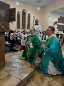 Os ritos continuaram com a entrega da pia batismal e do confessionário, além da chave do sacrário, que foi levado pelo ministro extraordinário da santa eucaristia, o senhor Osternes e entregue ao Padre Welson, que abriu o sacrário e em silêncio ficou um breve momento de oração e reflexão ao lado do bispo.
