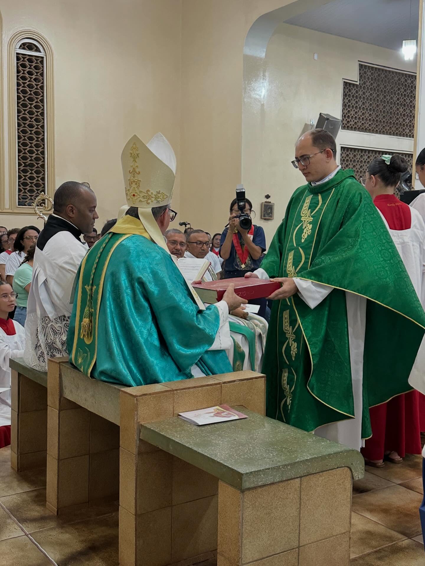 Os ritos continuaram com a entrega da pia batismal e do confessionário, além da chave do sacrário, que foi levado pelo ministro extraordinário da santa eucaristia, o senhor Osternes e entregue ao Padre Welson, que abriu o sacrário e em silêncio ficou um breve momento de oração e reflexão ao lado do bispo.