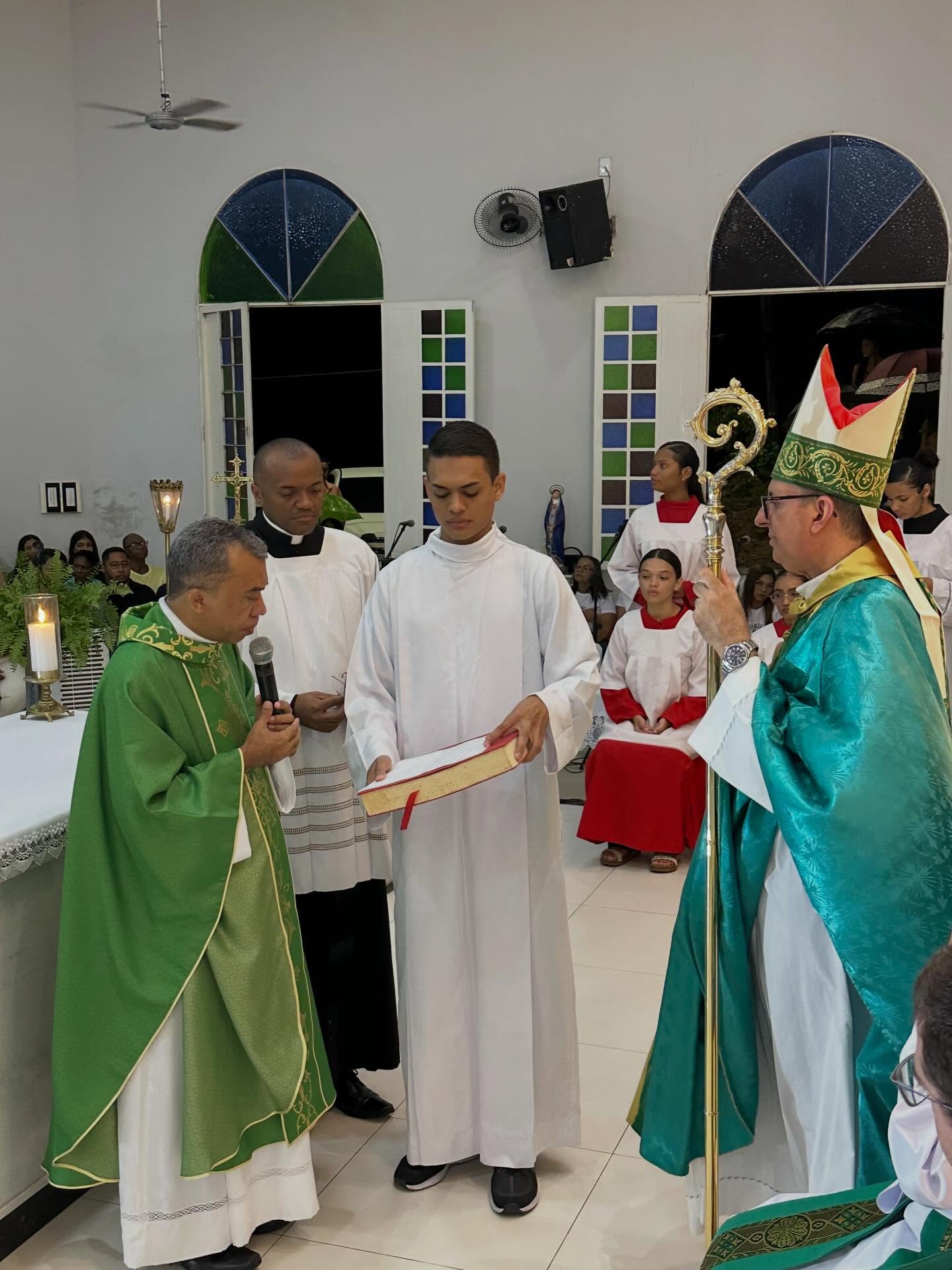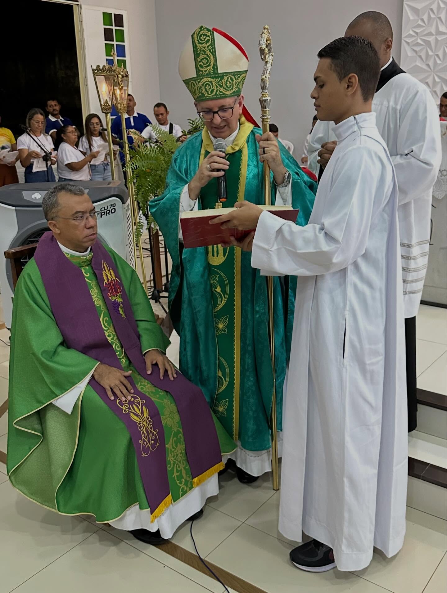 A Santa Missa foi presidida pelo bispo diocesano, Dom Edilson Soares Nobre, que conduziu o rito de posse conforme as normas da Igreja. Durante a celebração, foram realizados os gestos simbólicos próprios da posse canônica, entre eles a leitura da provisão, a profissão de fé e o juramento de fidelidade, confirmando oficialmente o início do ministério do novo pároco à frente da comunidade.