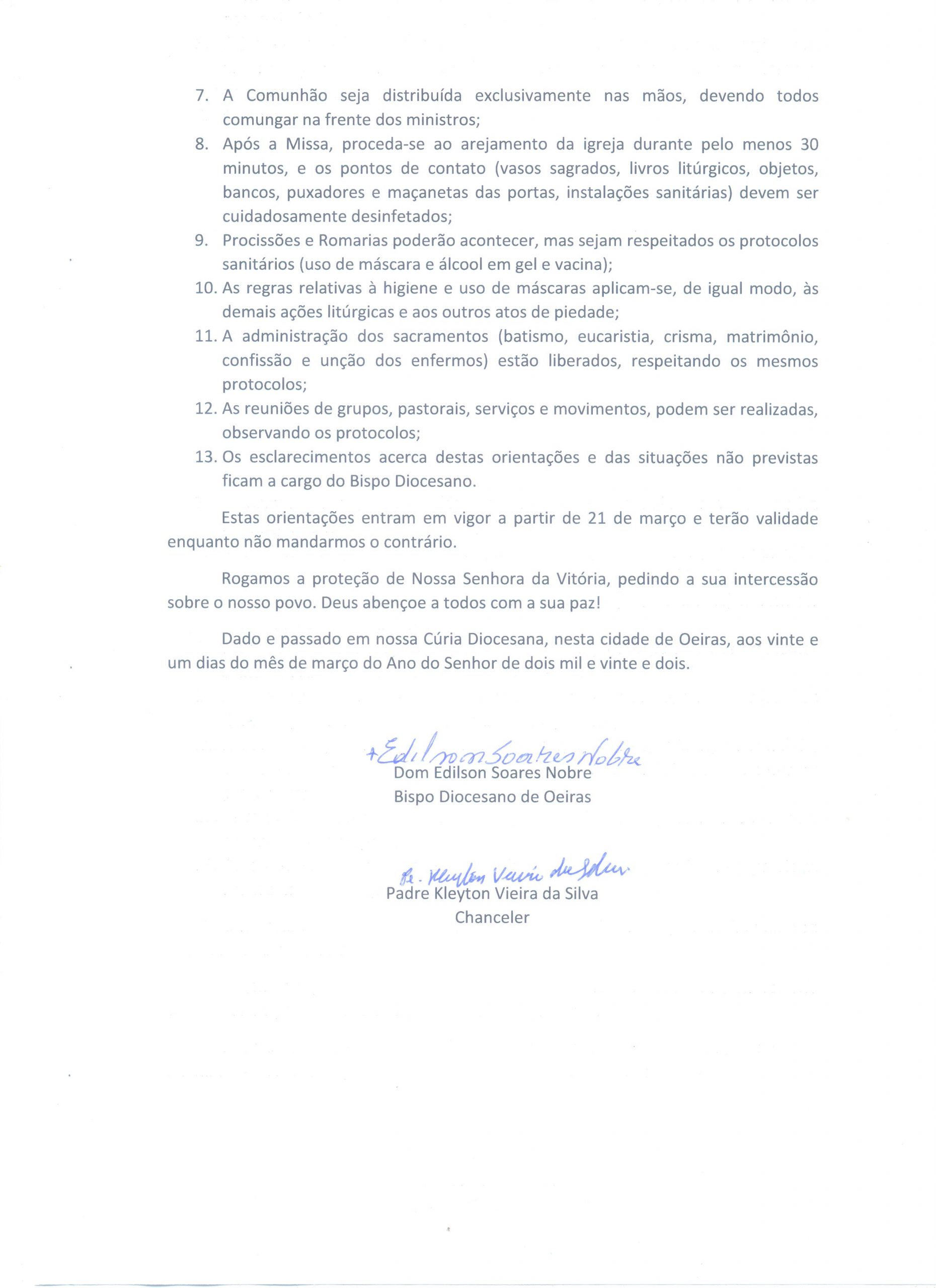 Dado e passado em nossa Cúria Diocesana, nesta cidade de Oeiras, aos vinte e um dias do mês de março do Ano do Senhor de dois mil e vinte e dois.