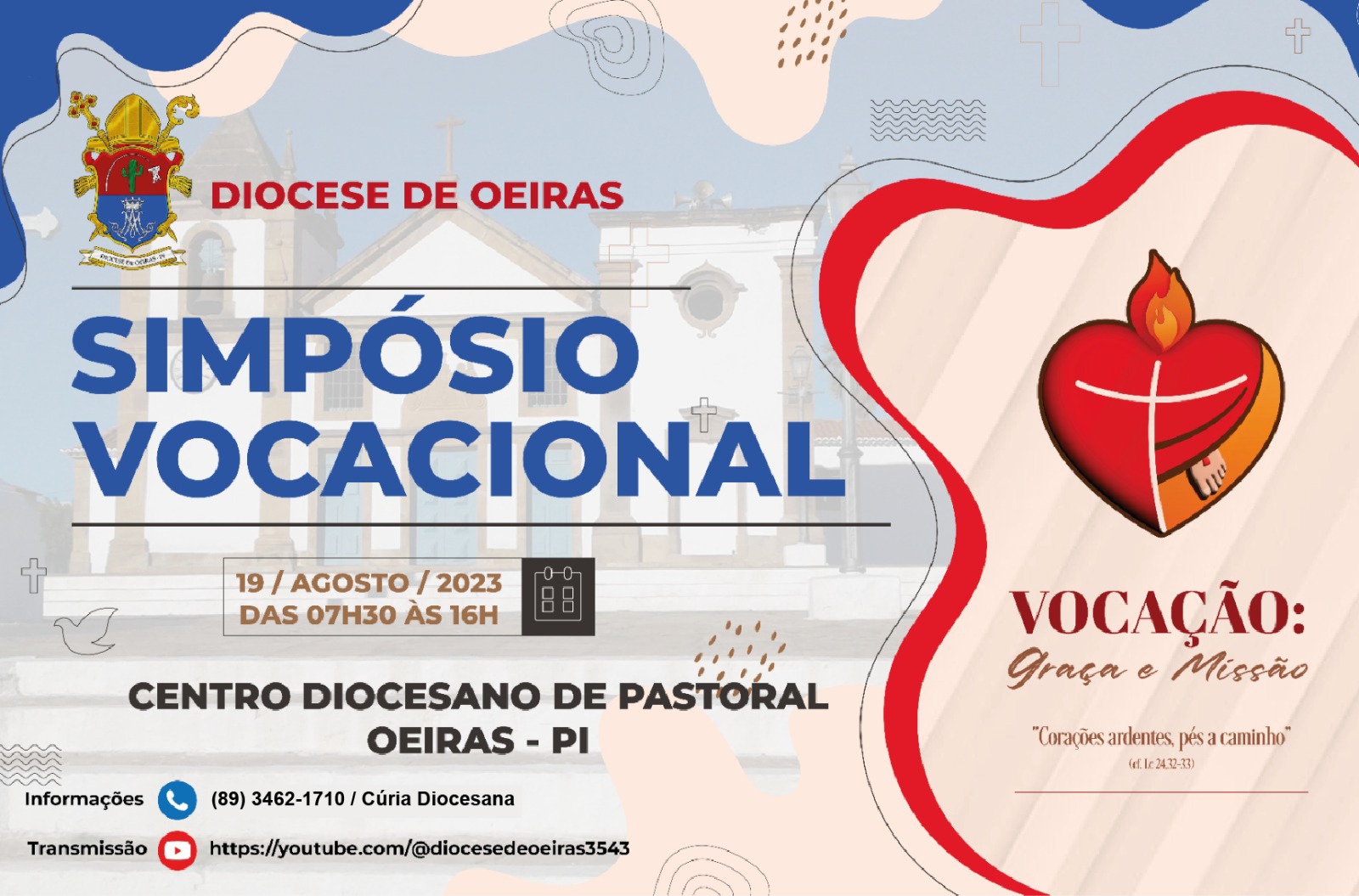 A Diocese de Oeiras vai promover Simpósio Vocacional, no dia 19 de agosto, com o tema ‘Vocação: graça e missão’ e lema ‘Corações ardentes, pés a caminho (Lc 24, 32-33). O evento vai acontecer no Centro Diocesano de Pastoral, das 7h30 às 16h, e será assessorado pelo bispo de Campo Maior e vice-presidente do Regional Nordeste 4 da Conferência Nacional dos Bispos do Brasil (CNBB), dom Francisco de Assis e o assessor da Comissão Episcopal para Animação Bíblico-Catequética da CNBB, padre Wagner Carvalho.