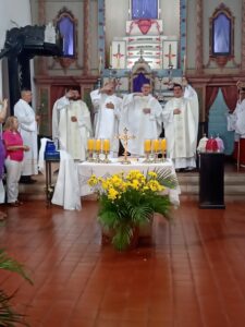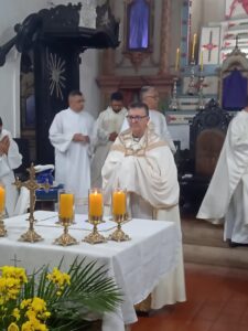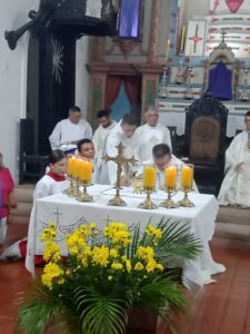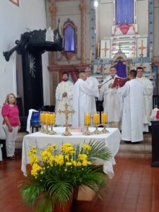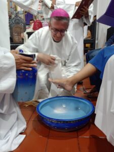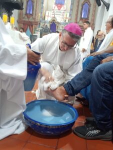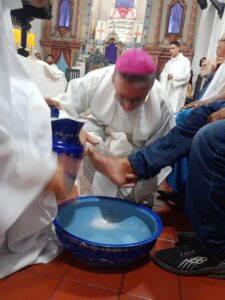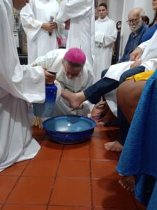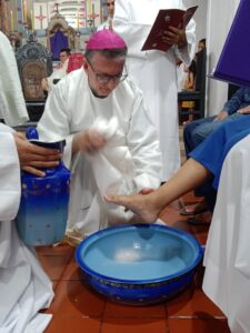 Dom Edilson em sua homilia enfatizou que esta liturgia nos faz trazer a memória e a instituição da Eucaristia. Por isso, neste dia, também nós rezamos e recordamos o ministério ordenado, sobretudo o ministério do sacerdócio, do Padre, do Presbítero, que celebra a Santa Missa, que faz com que esta Eucaristia seja atualizada na vida dos fiéis. Cada missa celebrada é a atualização deste mistério da paixão, morte e ressurreição do Senhor. Não é uma encenação, é uma atualização, é uma vivência, é uma experiência de encontro com o Senhor. Jesus se entrega. Em cada missa, Jesus entrega e derrama o seu sangue. Em cada missa, Jesus torna-se para nós o sinal de libertação, porque Ele é descendente da cruz. Não podemos esquecer disso, porque esta é a essência da fé católica. Durante a última Ceia Jesus se entrega para oblação de todos nós. Aqui estamos reunidos para vivenciar está ato do lava-pés que toca no mais profundo do ser, pois aquele que é Deus feito homem se despoja de suas vestes para lavar os pés de seus discípulos exortando-os a lavarem os pés uns dos outros, pontuou Dom Edilson.