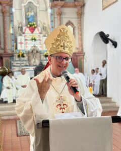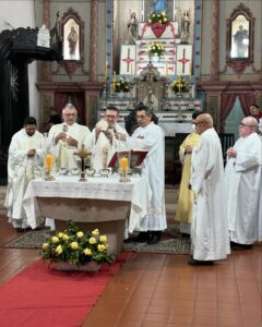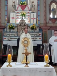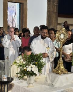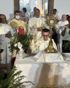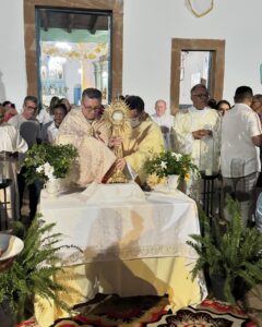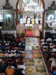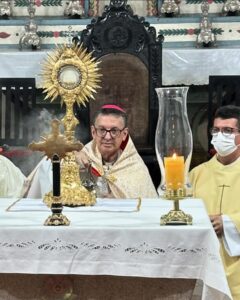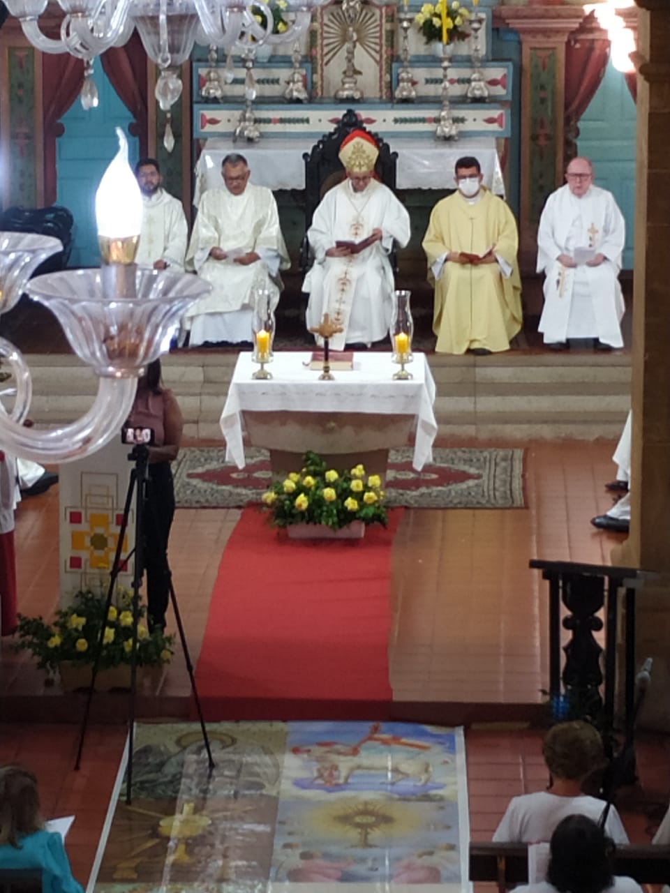 Na homilia, Dom Edilson, ressaltou que a Eucaristia é ” fonte e ápice de toda a vida cristã “. “Os demais sacramentos, assim como todos os ministérios eclesiásticos e tarefas apostólicas, ligam-se à Sagrada Eucaristia e a ela se ordenam, pois a Santíssima Eucaristia contém todo o bem espiritual da igreja, a saber, o próprio Cristo, nossa Páscoa “. Seguiu falando as várias denominações, a riqueza inesgotável deste sacramento exprime-se nos diversos nomes que lhe são atribuídos: Eucaristia- porque é ação de graças a Deus evoca as obras de Deus: criação, redenção e santificação; Ceia do Senhor- pois se trata da ceia que o Senhor fez com seus discípulos na véspera de sua paixão, e da antecipação da ceia das bodas do Cordeiro, na Jerusalém celeste Fração do Pão – porque este rito, próprio da refeição judaica, foi utilizado por Jesus, quando abençoava e distribuía o pão como presidente da mesa, sobretudo por ocasião da última Ceia; Assembleia Eucarística- porque a Eucaristia é celebrada na assembleia dos fiéis, expressão visível da Igreja; Memorial da Paixão e Ressurreição do Senhor santo sacrifício- porque atualiza o único sacrifício de Cristo Salvador e inclui a oferenda da Igreja. Igualmente: santo sacrifício da Missa, sacrifício de puro e santo, pois realiza e supera todos os sacrifícios da Antiga Aliança Santa e divina liturgia- porque toda a liturgia da Igreja encontra seu centro e sua expressão mais densa na celebração deste sacramento. É denominada ainda Celebração dos Santos Mistérios ou Santíssimo Sacramento, por ser o Sacramento dos Sacramentos. Com igual denominação designam-se as espécies eucarísticas, guardadas no tabernáculo/sacrário; Comunhão- porque, por este sacramento, nos unimos a Cristo que nos torna participantes do seu Corpo e do seu Sangue, para formamos um só corpo. Denomina- se ainda: pão dos anjos, pão do céu, remédios de imortalidade, viatico… Santa Missa- porque a liturgia, na qual se realizou o mistério da salvação, termina com o envio dos fiéis ( ” missio”, envio) para que cumpram a vontade de Deus em sua vida cotidiana. O milagre da Eucaristia é contínuo. Em cada Missa que participamos dá-se a transformação da carne em hóstia (“isto é meu corpo”) e do vinho em sangue (“isto é o meu sangue”).