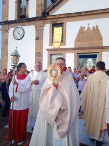Dom Edilson, concluiu dizendo, que depois de participarmos do sacrifício da Santa Missa, somos chamados a manifestar publicamente a nossa fé na Eucaristia, percorrendo algumas ruas de nossa cidade. As três paróquias reunidas, em sinal de unidade, junto ao seu bispo, seus padres e as comunidades de fé que as integram. Manifestamos para o mundo o que significa Jesus Cristo para nós e o quanto a Eucaristia pode nos transformar, realizando verdadeiros milagres que geram conversão, cura, vida nova, união, perdão, respeito mútuo e tantas outras possibilidades, pois, a ação de Deus é imprevisível, é imensurável e é surpreendente. Viva Cristo, caminho verdade e vida, o Pão da Alegria descido do céu!